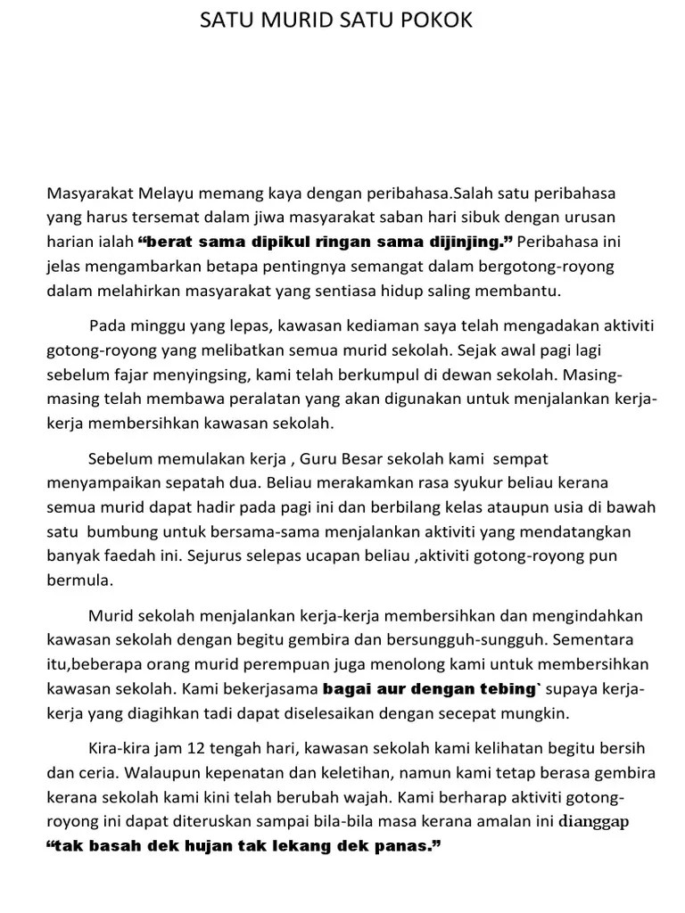 Anak yang sakit itu badannya kurus …. Jelasnya, aktiviti gotong royong dapat menyelesaikan sesuatu tugas dalam tempoh masa yang singkat dan memupuk nilai kerjasama. C) persoalan tentang sikap mementingkan diri dalam kalangan masyarakat: Amalan ini perlu dipupuk dan disematkan dalam diri dan minda setiap ahli masyarakat agar … Panjang karangan anda hendaklah antara 200 hingga 250 patah perkataan.